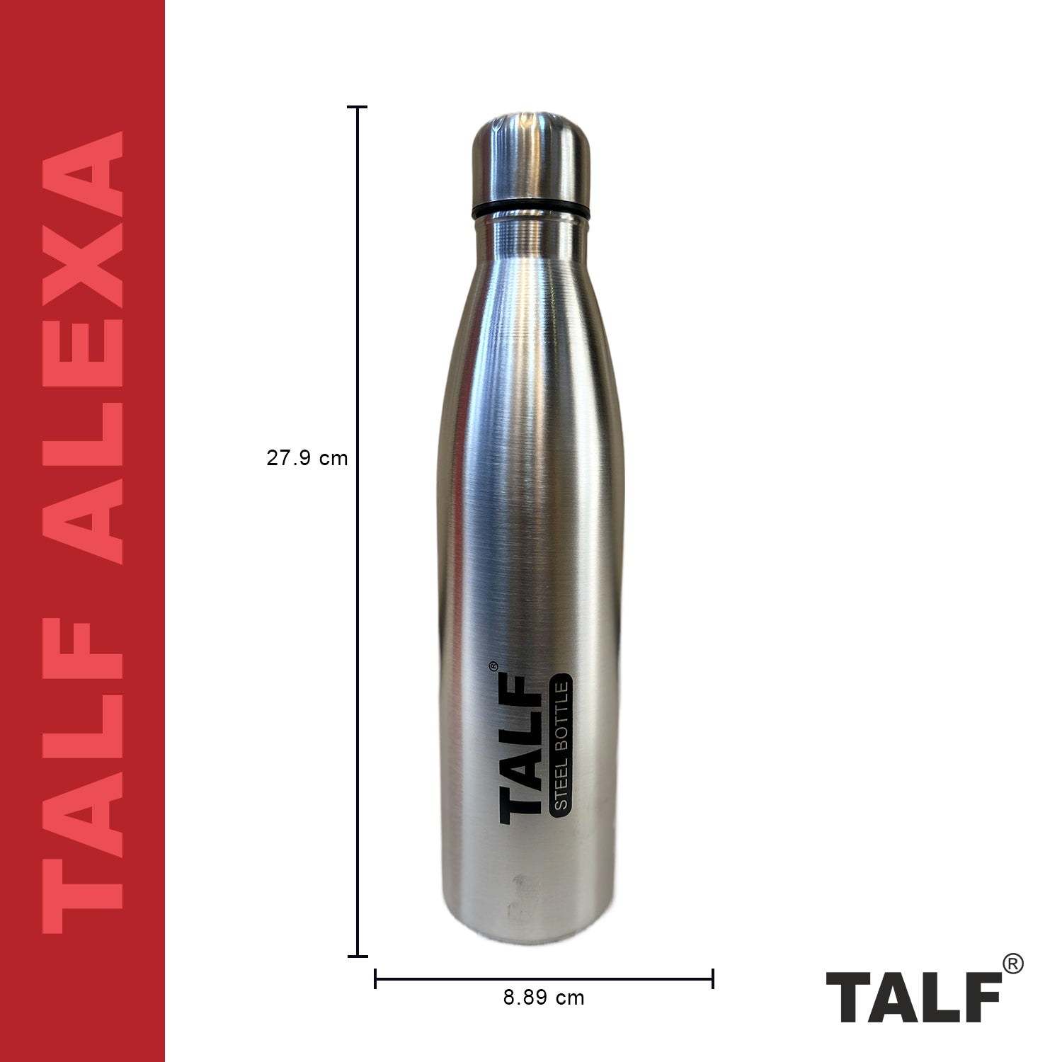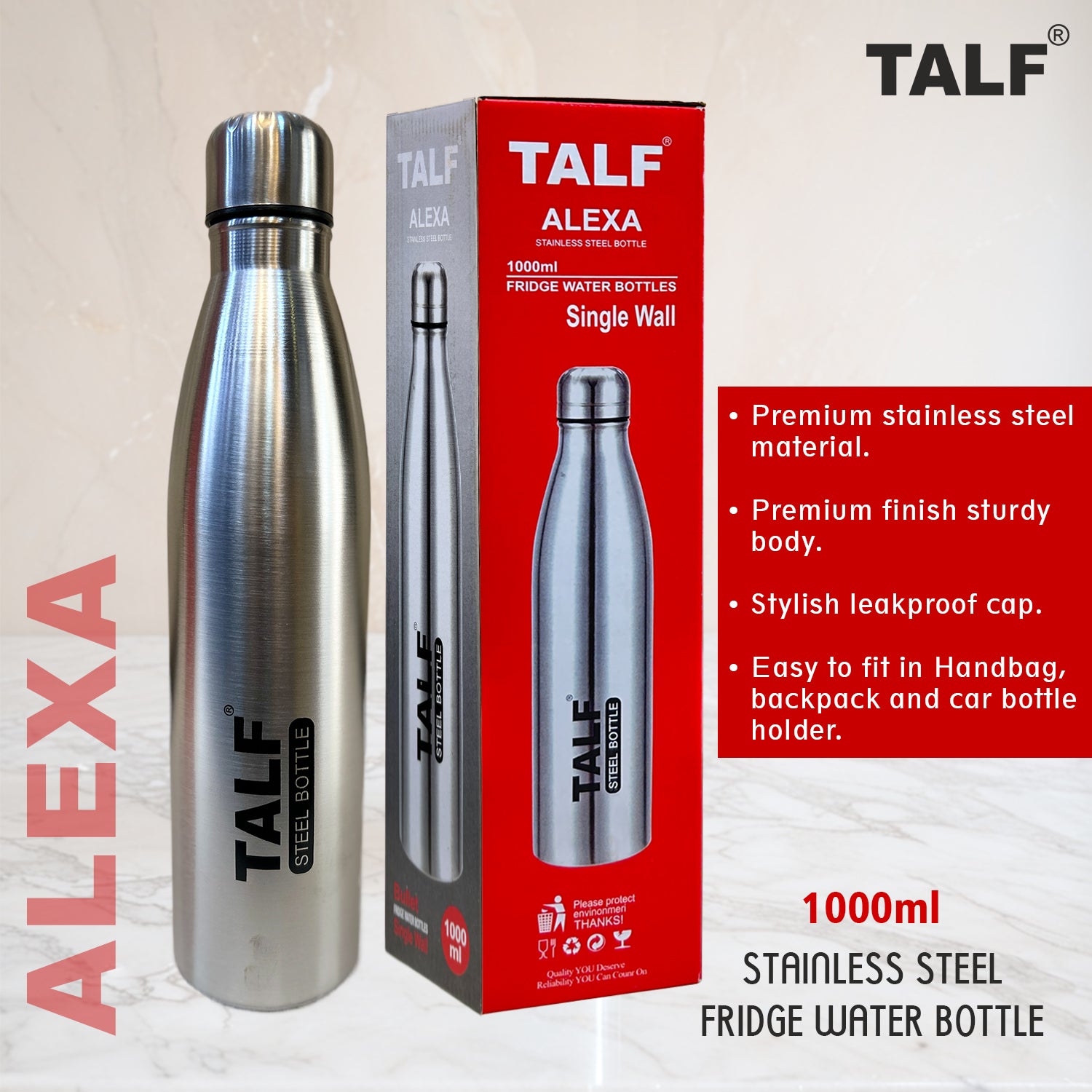 TALF ALEXA Stainless Steel Water Bottle, 1000ml, Single Wall, Leakproof, Silver, Fridge Water Bottle